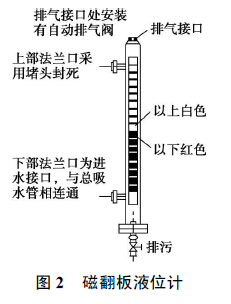 由于在丙酸液位計的進水接口法蘭處安裝有閥門, 在平時不需要水泵水輪機排水檢修時, 該閥門處于關閉狀態, 必要時可以通過裝置底部的排污閥門把液位計主導管內的水排空。