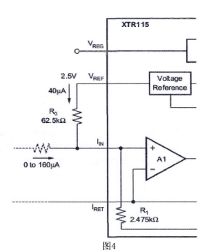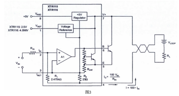 把傳感器輸出的不同電壓轉(zhuǎn)換成標準的4-20ma輸出,可采用不同的電路形式。成本低的可采用分立器件,但是為了達到比較高的精度,要保證相應器件的匹配程度,調(diào)試也比較麻煩。TI公司推出的XTR 系列工業(yè)傳感器專用的4-20ma的一體化變送器集成電路,采用該系列產(chǎn)品設計的變送器成本低,精度高,調(diào)試簡單。經(jīng)過選擇決定使用XTR115完成設計。內(nèi)部結(jié)構(gòu)如圖三: