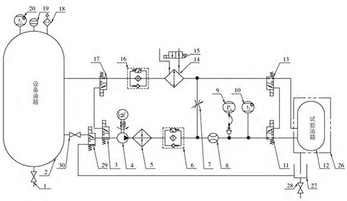 油液供油:原理中油液經(jīng)吸油開關(guān)(30)、L 形三通電動閥(3、29)、油泵(4)、加熱器(5)、供油過濾器(6)、流量計(jì)(8)、L 形三 通 電 動 閥(11)后進(jìn)入被測油箱,然后 經(jīng) L形三通電動閥(13)、油水換熱器(14)、回油過濾器(16)、L 形三通電動閥回到設(shè)備油箱中,此條支路可提供被測油箱剛安裝于試驗(yàn)臺上時(shí)的油液供給,通過流量計(jì)軟件計(jì)時(shí)的方法判斷補(bǔ)油量。