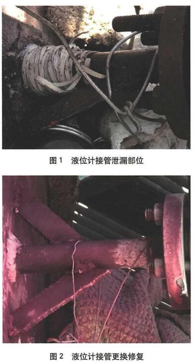 圖1是分離罐液位計接管泄漏部位,圖2則是停工搶修更換并經檢查合格的重油液位計接管。泄漏發生在重油液位計接管靠近罐體部位(臨時用白色膠帶纏繞處),修復后的重油液位計接管仍釆用原設計結構,但接管壁厚增加,變更為必25x4mm。