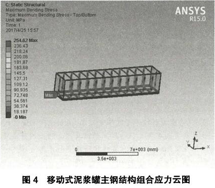 (3)導熱油液位計罐體材質為Q345b低合金鋼,使用時放置于地面,對結構底部設置位移約束141。2.2應力分析基于上述載荷和邊界條件,經過計算,儲存罐罐面結構的Mises應力*大值出現在側端面底部,*大值為185.83MPa;儲存罐主鋼結構*大彎曲應力與*大組合應力出現在側面加強槽鋼底部,分別為254.62MPa與265.08MPa(圖2 ̄圖4)。