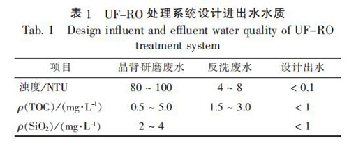 國內某酸液液位計廠, 晶背研磨廢水產生量為 150 ~160 m3 / d, 反洗廢水產生量 為 500 ~ 700 m3 / d, 主要污染物為懸浮物, UF-RO 處理系統設計進水和出水主要水質指標見表 1。