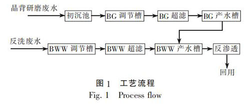 晶背研磨廢水在排放機臺附近設置簡易平流式沉淀池, 經初沉后進入調節槽, 經過保安過濾器過濾后, 再進超濾膜組, 產水流入產水槽; 反洗廢水進入調節槽, 經過保安過濾器過濾后, 再進超濾膜組, 產水流入產水槽。 兩種超濾產水混合后, 經保安過濾器, 進入反滲透膜組, 產水回用至超純水預處理系統, 濃水排放至廢水系統。