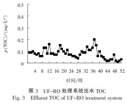 經過 1 年的連續運行, 晶背研磨廢水進水 TOC質量濃度為 0.5 ~ 5.0 mg / L, 濁度為 80 ~ 100 NTU,SiO2 質 量 濃 度 為 2 ~ 4 mg / L, 反 洗 廢 水 進 水 TOC質 量 濃 度 為 1.5 ~ 3.0 mg / L, 濁 度 為 4 ~ 8 NTU,UF-RO 處理出水 TOC 質量濃度低于 1 mg / L, 濁度低于 0.1 mg / L, SiO2 質 量 濃 度 低 于 1 mg / L, 完 全可以回用至超純水預處理系統。 UF-RO 處理系統出水電導率和 TOC 濃度見圖 2 ~ 圖 3。