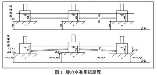 靜力水準儀依據連通管的原理,采用振弦式傳感器,測量每個測點 容器內液面的相對變化,再通過計算公式求得相對于基準點的沉降量,如圖 1 所示。