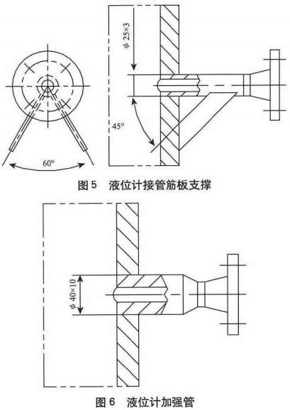 圖5是泄漏丙酸液位計接管結構,雖然必25mmx35mm接管的開孔補強滿足GB150-1989標準[11“開孔不另行補強”的要求,但卻不符合現行標準GB/T150-2011的“開孔不另行補強”要求。因為,兩標準雖然限制的設計壓力(<2.5MPa)與接管外徑(<89mm)等條件相同,但是后者改版標準卻對接管壁厚及腐蝕裕量增加了要求,這是合理的改進完善。對于本例的425mm接管,滿足GB/T150-2011的“開孔不另行補強”條件的管壁厚度至少應為5.5mm(按標準規定當腐蝕裕量為1mm時,接管厚度應不小于3.5mm)。所以,按HG/T20583-2011對小接管避免彎曲而推薦的加強結構優先選用加強管形式建議將液位計接管更改為圖6的加強管結構。這樣不但解決了小接管的開孔補強和防彎曲加強問題,也可以使小接管的設計使用年限與罐體一致,而且便于保證小接管與罐體采用插人式全焊透角焊縫的焊接質量。