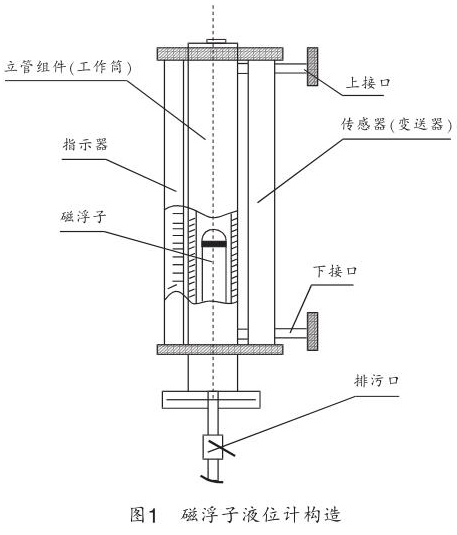 遠傳式電伴熱型磁翻板液位計由磁浮子、工作筒、指示器、遠傳變送器組成,如圖 1 所示。