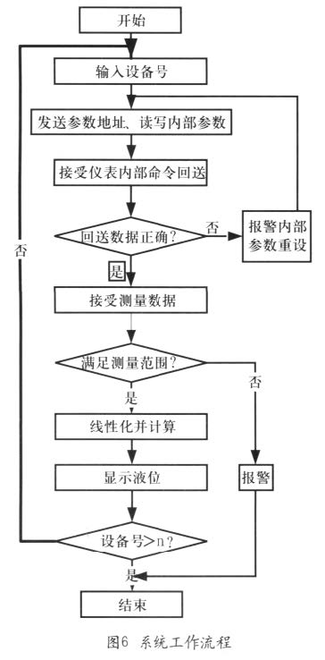 系統(tǒng)工作流程如圖6所示。*先對容器設(shè)備進(jìn)行基本測量。輸入容器高度E,滿載高度F及應(yīng)用參數(shù)A(A是用來將儀表調(diào)到滿足測量要求的應(yīng)用參數(shù))。這些參數(shù)輸入后,由智能顯示儀表或計(jì)算機(jī)得到的操作矩陣將被鎖定,以保證設(shè)置不受意外情況影響,再對采集到的數(shù)據(jù)線性化(線性化過程描述了測量電平與罐容量或產(chǎn)品重量間的關(guān)系)之后,測量值將在相應(yīng)部分顯示出來。