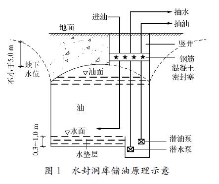 1.1 儲油原理水封洞庫通過人工在地下巖石中開挖形成,其密封是通過地下水向洞內滲透實現,即水封洞庫必須建在穩定的地下水位線以下一定的深度,洞罐的埋深與洞室儲存介質的*大工作壓力、工程地質和水文地質條件、穩定的地下水位等因素有關,其埋深應保證洞庫周圍的地下水壓力大于洞內儲存介質的壓力。正常儲存時,洞外部地下水壓力大于洞內介質壓力,地下水只能向洞內滲透,而洞內介質不能向洞外滲漏,同時利用油比水密度小以及油水不能混溶的特點,滲入洞內的水沿洞壁匯集到洞底部形成水墊層,從而達到將所儲介質封在洞內的目的。滲入洞內的水可由油水界面檢測儀表進行檢測,待達到一定高度時,用安裝在洞內的潛水泵將水排出洞外。水封洞庫儲油方法有固定水位法和變動水位法,采用變動水位法儲油新鮮水的需求量和污水處理量大,運行費用高,因而目前多采用固定水位法,儲油原理示意如圖1所示。
