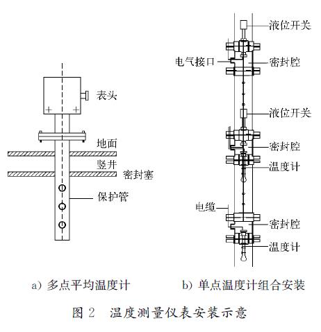2)2)采用單點溫度計用組合套管安裝的方式,將幾支單點溫度計組合安裝在一根不銹鋼套管內,測量不同高度油品的溫度。單點溫度計與液位開關合用1根套管,安裝示意如圖2b)所示。