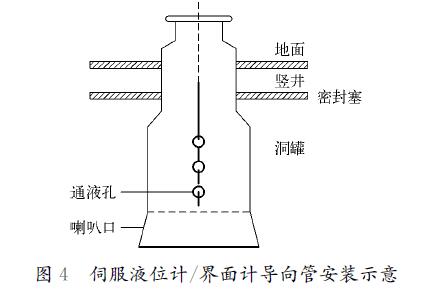 儀表安裝應便于儀表維護、更換及觀測,儀表的觀測面應朝向操作通道,周圍不應有妨礙維修儀表的物件,因而洞罐液位計、界面計和多點平均溫度計的變送單元均安裝在豎井口。考慮到洞罐埋設深度及洞罐儀表檢測元件的長度,為便于儀表安裝,保護洞罐儀表的檢測元件,為伺服液位計、伺服界面計及多點平均溫度計設置了液位計、界面計導向管及溫度計保護管。導向管、保護管安裝時,從上到下的垂直誤差一般小于導向管、保護管口徑的10%,并徹底處理好導向管通液孔的毛刺;焊接必須采用套焊,焊縫必須清理干凈;安裝時,必須保證洞罐儀表與導向管、保護管連接法蘭的水平度,一般控制在1°之內,伺服液位計、界面計導向管安裝示意如圖4所示。
