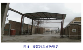 4)液氨裝車點移位改造。液氨裝車點不規(guī)范。根據(jù)相關(guān)要求,液氨裝車時,周圍不能有機動車通行,但液氨裝車點位于14號馬路西側(cè)5m處,對車輛及施工人員并無法完全封閉,裝車存在很大的安全風(fēng)險。以前,液氨裝車由汽提崗位外操負(fù)責(zé),由于外操工作繁忙,造成液氨裝車過程的監(jiān)督時斷時續(xù),為解決這一隱患,車間指派專人負(fù)責(zé)監(jiān)管液氨裝車的全過程。監(jiān)管人員不但要檢查接頭有無泄漏,還要核實駕駛員和押運員的資質(zhì)。車間根據(jù)液氨裝車的實際情況,編制《液氨裝車泄漏應(yīng)急操作卡》、《液氨裝車操作規(guī)程》,以便進一步規(guī)范液氨裝車操作程序。應(yīng)分開設(shè)置液氨裝卸站的進出口,當(dāng)進出口合用時,站內(nèi)應(yīng)設(shè)回車場。由于液氨裝車點東側(cè)5m處就是煉油區(qū)雨排系統(tǒng),為了解決液氨裝車過程泄漏噴淋水污染公司煉油區(qū)雨排系統(tǒng),在裝車點東西側(cè)各增設(shè)圍堰。從圖4可以看出:液氨裝車點改造后,現(xiàn)場更為規(guī)范,管理更為嚴(yán)格。